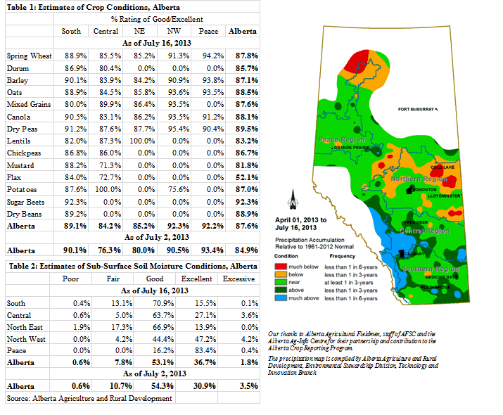 - Crop conditions remain virtually unchanged from two weeks ago with about 94 per cent of spring wheat, barley and oats, and about 90 per cent of canola and dry peas rated as good to excellent. Some producers reported problems with lygus bugs.