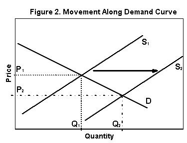 When a bumper crop develops supply shifts outward and downward, shown as S2 in Figure 2; more product is available over the full range of prices. With no immediate change in consumers' willingness to buy crops, there is a movement along the demand curve to a new equilibrium. Consumers will buy more but only at a lower price. How much the price must fall to induce consumers to purchase the greater supply depends upon the elasticity of demand.