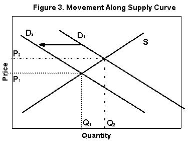 or to the left, as seen in Figure 3. With no immediate change in supply, the effect on price comes from a movement along the supply curve. An inward shift of demand causes price to fall and also the quantity exchanged to fall. The amount of change in price and quantity, from one equilibrium to another, is dependent upon the elasticity of supply. Imagine that supply is almost fixed over the time period being considered. That is, draw a more vertical supply curve for this shift in demand. When demand shifts from D1 to D2 on a move vertical supply curve (inelastic supply) almost all the adjustment to a new equilibrium takes place in the change in price.