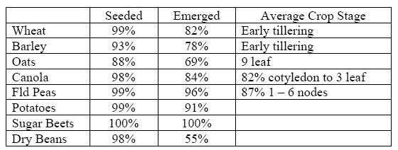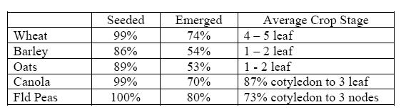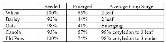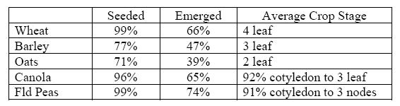In the North Central area of the province, seeding is 90% completed with a further 7% expected to be seeded. It is anticipated that approximately 3% will remain unseeded with the most affected areas in the NW portion due principally to low areas which remain too wet to access. Crops are late with only half to two thirds having emerged to date.