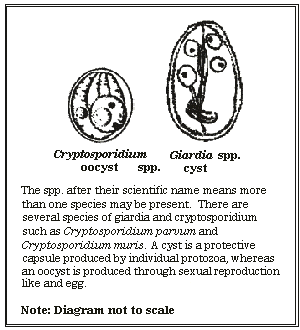 Cryptosporidium spp. (cryptosporidium) and Giardia spp. (giardia) are intestinal parasites that can infect humans, domestic livestock and wildlife, as well as other animals, including birds. They are single-celled organisms called protozoa. Human symptoms of infection include profuse, watery diarrhea, fever and nausea. Although giardia infections (popularly called "beaver fever") are treatable with drugs, cryptosporidium infections are not. As well, cryptosporidiosis can be life threatening for people with poorly functioning immune systems, such as those with AIDS or cancer, infants and the elderly. Consequently, these parasites represent a significant risk to public health.