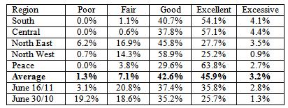 Surface and sub surface soil moisture ratings have improved significantly due principally to the precipitation received in the northerly regions. Excessive moisture has now become an issue in the North East, North West and Peace regions.