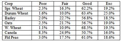 Crop condition ratings have increased for all crops with the improved weather but crop development remains behind long term averages due to the slow start to seeding and the below average temperatures experienced in May and the first half of June in all regions.