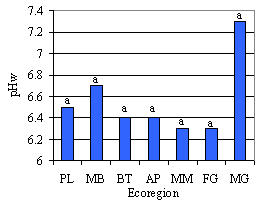 In contrast to ecoregions where relatively large differences were not significant, relatively small differences among slope positions were often significant. For example, the mean pH of sites in the MG Ecoregion (7.3) was not significantly different from the MM Ecoregion (6.3), but the mean pH of upper slopes (6.7) was significantly higher than for the mid and lower slopes (6.5) [Tables 1 and 2]. The lack of significant differences in soil properties between ecoregions is in part a result of large variations in properties within ecoregions but it should also be noted that the statistical power for testing differences between slope positions is greater than between ecoregions. The magnitude of the difference required for statistical significance between ecoregions compared to slope positions is illustrated in Figures 2 to 5.
