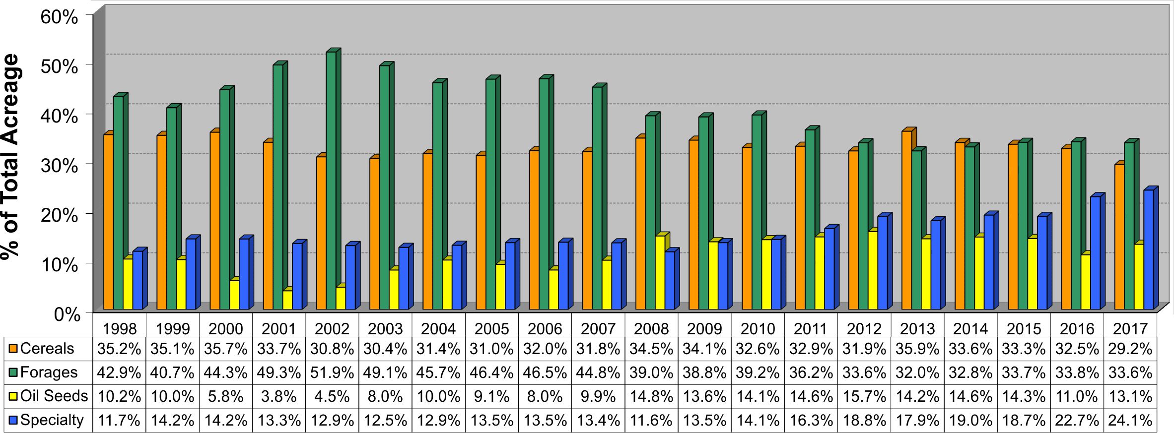 Crop trends within the thirteen irrigation districts in southern Alberta.