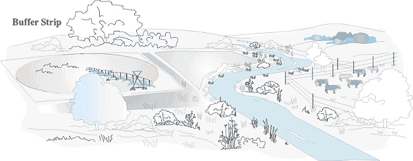 Buffer strips border drainage ditches, irrigation canals and wetlands. They receive the diffuse or scattered runoff from non-point sources such as cropland. Flow of water through a buffer strip is generally small and only occurs following a precipitation event or during irrigation.