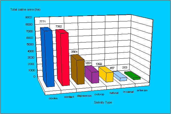 Coulee bottom salinity is the most common type (34.5% of the total saline area), followed by contact/slope change salinity (32.7%), depression salinity (15.8%), outcrop salinity (7.5%), natural/irrigation salinity (6.2%), irrigation canal seepage salinity (2.0%), and artesian salinity (1.3%).