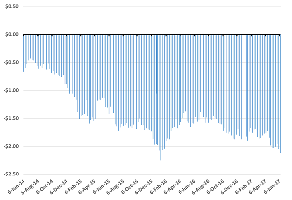 Here is an example using the graph above, with reference to the area in black ovals. At the beginning of November 2014, you can see that the unadjusted basis value (blue line) was around 0.53 over the futures price. January 2016 unadjusted basis levels were about 1.50 over. During that interval, the unadjusted basis fluctuated significantly and strengthened from 0.53 over to 1.50 over. However, during the same time period the adjusted basis value (red line) shows an opposite trend. The adjusted basis has actually weakened from 0.21 under to 0.50 under. The two different methods for calculating basis display opposing trends as shown by the black arrows in the above chart.