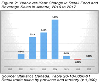 A closer look at food and beverage sales through Alberta retail grocery stores shows that sales started to slow down after 2014 and bottomed out in 2016. However, sales turned around in 2017, reflected by the very slight increase in growth for that year. Total food and beverage grocery sales in 2017 for Alberta was $14.65 billion.